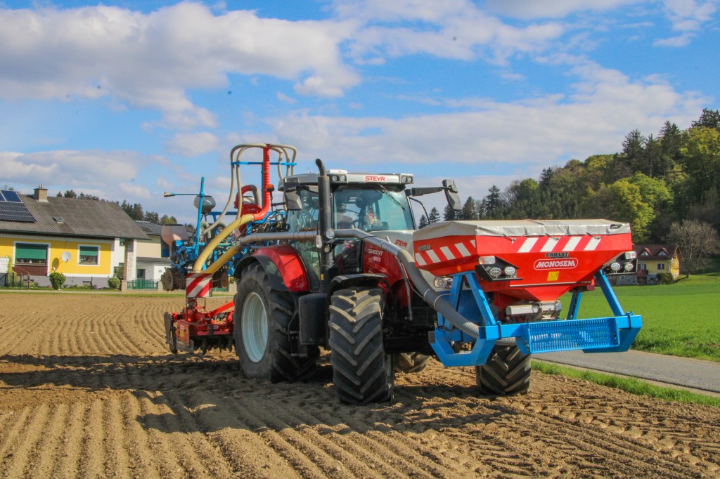 Mit dem 7-Reihigen Maissetzgerät und Fronttank wird die Einzelkornsaat (Mais, Sorghumhirse, Sojabohne und Kürbis) ausgeführt. Die Bodenvorbereitung ist mittels Kreiselegge möglich.